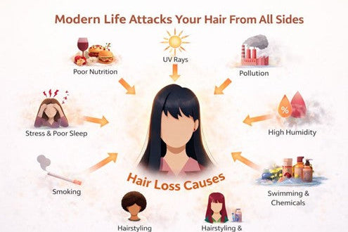 Modern lifestyles—stress, hormonal imbalance, pollution, poor nutrition, hard water, and harsh chemical treatments—disrupt scalp health and weaken hair at its foundation.